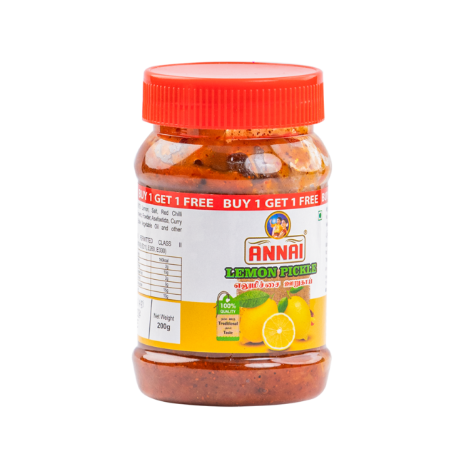 Enjoy the tangy and spicy goodness of Annai Dates Lemon Pickle, made from sun-ripened lemons and traditional spices for an authentic homemade taste.